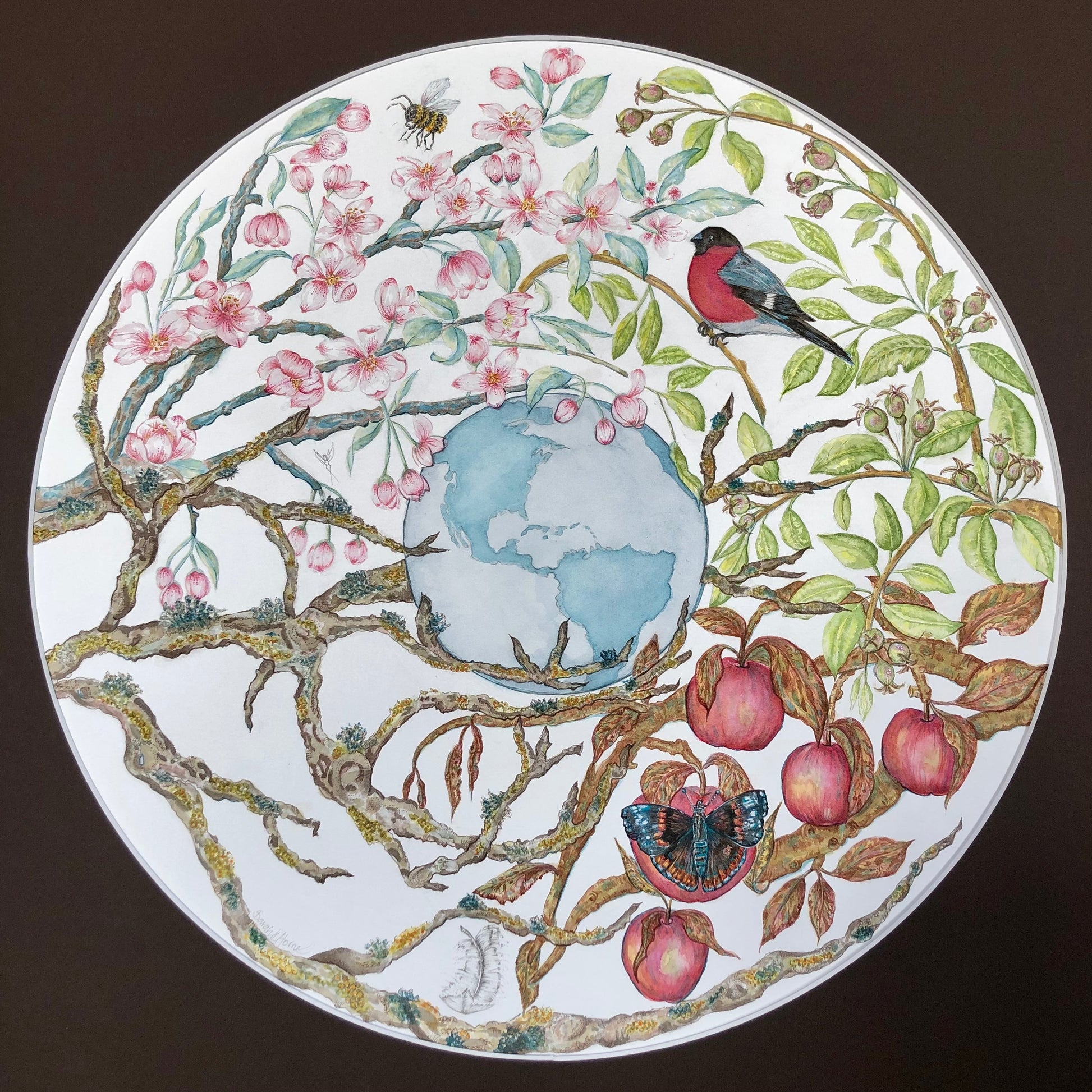 A beautiful contemporary round painting which is full of meaning. It depicts an apple tree through the seasons along with some of the wildlife that it supports. If we you get to winter there is a dark symbolism. Many many hours went in to creating this piece, it is true labour of love!